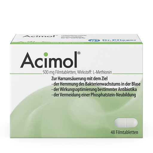 Acimol® bietet wirksame Hilfe bei Blasenentzündungen und Harnwegsinfekten durch natürliche Harnansäuerung. Der Wirkstoff L-Methionin ist eine körpereigene Aminosäure, die für eine Ansäuerung des Harns sorgt. In diesem sauren Milieu wird die Vermehrung von Bakterien – insbesondere E.coli als häufigster Auslöser von Blasenentzündungen – gehemmt. Neben der Behandlung von Harnwegsinfektionen wird Acimol® auch zur Vorbeugung von Harnsteinen (insbesondere Phosphatsteinen) sowie zur Optimierung der Wirkung bestimmter Antibiotika eingesetzt.