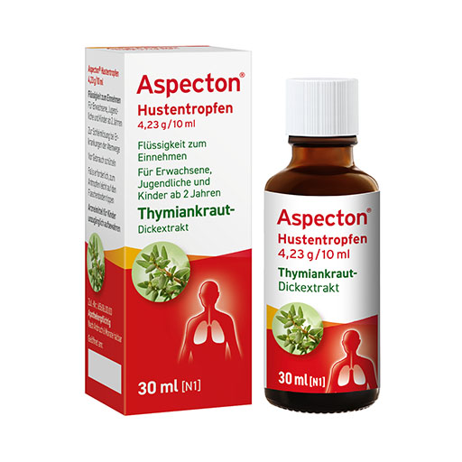 Aspecton® Hustentropfen sind ein wirksamer Hustenlöser. Die Tropfen enthalten jeweils einen hochkonzentrierten Extrakt aus Thymiankraut. Sie lösen zähen Schleim und erleichtern damit das Abhusten, lindern schmerzhafte Verkrampfungen der Bronchialmuskulatur und hemmen das Wachstum von Bakterien. Der Hustenreiz wird gelindert. Daher sind Aspecton® Hustentropfen besonders dann empfehlenswert, wenn ein Husten mit starker Schleimbildung und/oder krampfartigen Hustenanfällen einhergeht.
