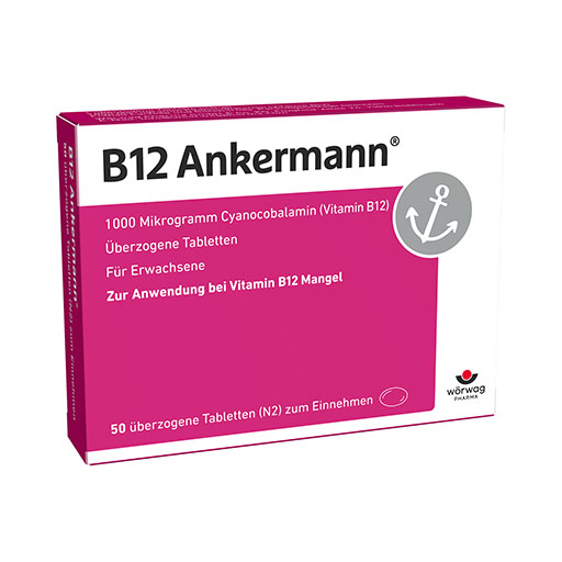 B12 Ankermann®. Wirkstoff: Cyanocobalamin 1000 μg (Vitamin B12). Anwendungsgebiete: Behandlung von Vitamin-B12-Mangelzuständen, die durch Mangelernährung verursacht werden, Behandlung (Erhaltungstherapie) von Vit.-B12-Mangelsyndromen, z. B. infolge einer beeinträchtigten Resorption von Vit. B12 (z. B. infolge atrophischer Gastritis, entzündlicher Darmerkrankung, Zöliakie, totaler o. partieller Gastrektomie, Ileumresektion, Magenbypass o. anderer bariatrischer Operationen, langfristiger Einnahme von H2-Histamin-Rezeptorblockern, Protonenpumpenhemmern, Aminosalicylaten u. Metformin), dauerhafte Behandlung einer durch Vit.-B12-Mangel induzierten perniziösen Anämie nach Normalisierung der Blutwerte. Die Behandl. einer perniziösen Anämie bzw. neurolog. Symptome erfolgt zu Beginn parenteral bis zur Normalisierung der Blutwerte. B12 Ankermann® wird angew. bei Er- wachsenen. Zu Risiken und Nebenwirkungen lesen Sie die Packungsbeilage und fragen Sie Ihre Ärztin, Ihren Arzt oder in Ihrer Apotheke. Wörwag Pharma GmbH & Co. KG, 71034 Böblingen