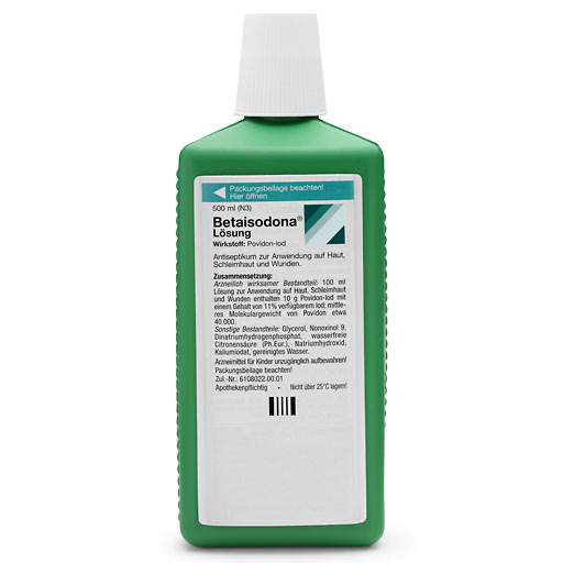 Anwendungsgebiete: Betaisodona® Lösung ist ein keimtötendes Mittel (Antiseptikum) zur Anwendung auf Haut, Schleimhaut und Wunden. Betaisodona® Lösung wird einmalig angewendet zur Desinfektion der intakten äußeren Haut oder Antiseptik der Schleimhaut wie z. B. vor Operationen, Biopsien, Injektionen, Punktionen, Blutentnahmen und Blasenkatheterisierungen. Betaisodona® Lösung wird wiederholt zeitlich begrenzt angewendet zur antiseptischen Wundbehandlung (z. B. Druckgeschwüre, Unterschenkelgeschwüre), bei Verbrennungen, infizierten und superinfizierten Hauterkrankungen sowie zur chirurgischen Händedesinfektion.
