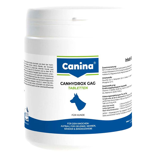 - Dicalciumphosphat: Ein organischer Stoff, der zu 50% im Knochen und zu 90% im Zahn enthalten ist. Er kann die Kallusbildung, die elastische Festigkeit des Knochens, die Ausbildung eines festen Zahnschmelzes, die Ausformung gerader Extremitäten (X- und O-Beine), Durchtrittigkeit und lose Gelenke unterstützen. Bei alten Hunden kann er den Abbau von Knochensubstanz vorbeugen und insgesamt das Skelettsystem unterstützen.