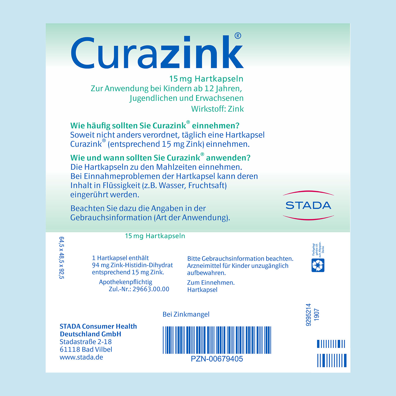 Täglich 1 Kapsel Curazink® (entsprechend 15 mg Zink) zu den Mahlzeiten einnehmen. Alternativ kann der Inhalt einer Kapsel in Flüssigkeit (z.B. Wasser, Fruchtsäfte) eingerührt werden.