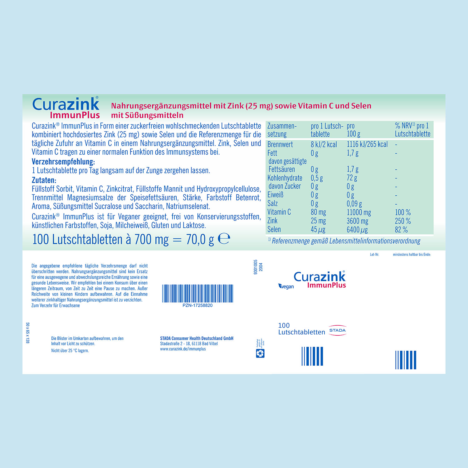 - Curazink® ImmunPlus ist gluten-, laktose- und zuckerfrei sowie vegan