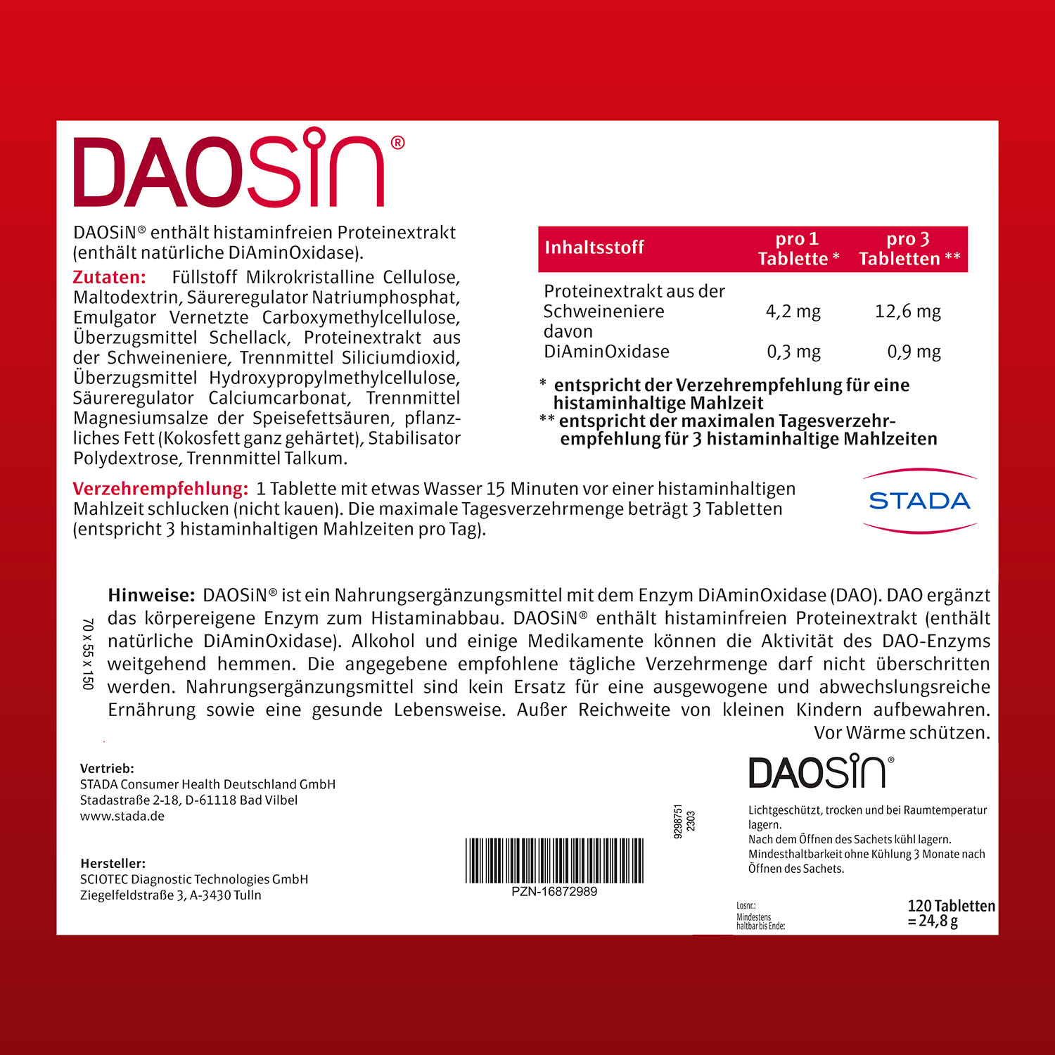 DAOSiN® ergänzt den Körper beim Abbau von Histamin aus der Nahrung. Durch die Einnahme von DAOSiN® Tabletten vor der Mahlzeit kann die DAO-Menge erhöht werden und im Verdauungstrakt ein ausreichender Abbau von Histamin aus der Nahrung erzielt werden.