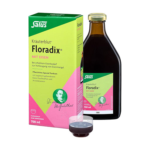 Soweit nicht anders verordnet, nehmen Erwachsene und Heranwachsende ab 10 Jahren 3-mal 15 ml pro Tag mit dem beiliegenden Messbecher ein. 45 ml FLORADIX® MIT EISEN enthalten 36,8 mg verwertbares Eisen(II).