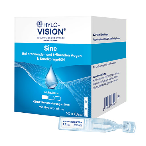 Zur Befeuchtung und zum Schutz der Augenoberfläche können Augentropfen mit Hyaluronsäure dienen. HYLO-VISION® Sine eignet sich sehr gut zur Linderung brennender, tränender Augen und einem Sandkorngefühl. Die leichtviskose Lösung verteilt sich leicht auf der Augenoberfläche und ist gut verträglich. Die Augentropfen sind besonders praktisch für unterwegs. Die wiederverschließbaren Ein-Dosis-Behältnisse sind nach der Öffnung noch 12 Stunden anwendbar.