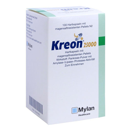 Als Wirkstoff ist Pankreatin in Kreon 25000 Kapseln enthalten. Verdauungsenzyme des Pankreas sind vor allem Lipasen, Amylasen und Proteasen. Diese Enzyme spalten Fette, Stärke und Eiweiße auf. Angewendet wird das Arzneimittel bei Verdauungsstörungen die durch ungenügende oder fehlende Funktion der Bauchspeicheldrüse ausgelöst werden sowie bei der Behandlung von Muskoviszidose, um die unzureichende Funktion der Bauchspeicheldrüse auszugleichen.