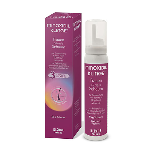 Anwendungsgebiete: Minoxidil Klinge Frauen Schaum stabilisiert bei Frauen den Verlauf der androgenetischen Alopezie vom weiblichen Typ (charakteristische, anlagebedingte diffuse Ausdünnung des Kopfhaares im Scheitelbereich), fördert das Haarwachstum und kann so dem Fortschreiten dieses Haarverlustes entgegenwirken.