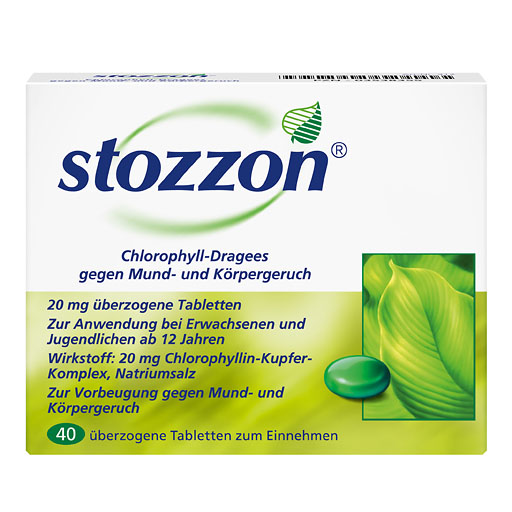 Viele Menschen leiden gelegentlich unter Mund- und Körpergeruch. Das Problem: Man nimmt den unangenehmen Geruch zwar bei anderen, nicht aber bei sich selbst wahr. Die Ursachen für Mund- und Körpergeruch sind vielfältig. So können Stoffwechselerkrankungen, Magen- und Darmstörungen, Entzündungen im Mund- und Rachenraum sowie andere Erkrankungen der Auslöser sein - ebenso wie Stress und seelische Belastung. Und jeder, der gern Knoblauch oder Zwiebeln isst, weiß, dass dies am nächsten Tag zu einer erheblichen Geruchsbelästigung der Mitmenschen führt. Was wenig bekannt ist: Auch Diäten oder unausgewogene Ernährung können durch den dadurch bedingten veränderten Stoffwechsel zu Mundgeruch führen. Der in Stozzon enthaltene Wirkstoff Chlorophyllin hat geruchsneutralisierende Eigenschaften. Der Wirkstoff aus dem natürlichen Blattgrün kann die Aktivität bestimmter eiweiß-spaltender Enzyme vermindern und auf diesem Wege die Bildung übler Gerüche hemmen. So können stozzon Chlorophyll-Dragees unangenehme Gerüche von innen heraus verhindern, noch bevor sie entstehen.