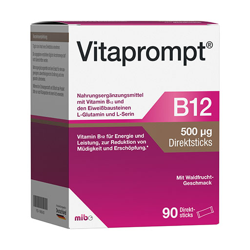 Egal ob im Job oder im Privatleben – unser moderner Alltag kostet uns oft jede Menge Energie. Ermüdungserscheinungen sind da keine Seltenheit. Vitaprompt® B12 500 μg Direktsticks füllt die Speicher auf und bringt den Energiestoffwechsel in Schwung. Zusätzlich enthält das Nahrungsergänzungsmittel ausgewählte Eiweißbausteine. Besonders praktisch: Das Direktgranulat kann ohne Wasser eingenommen werden. Auch für Veganer geeignet!